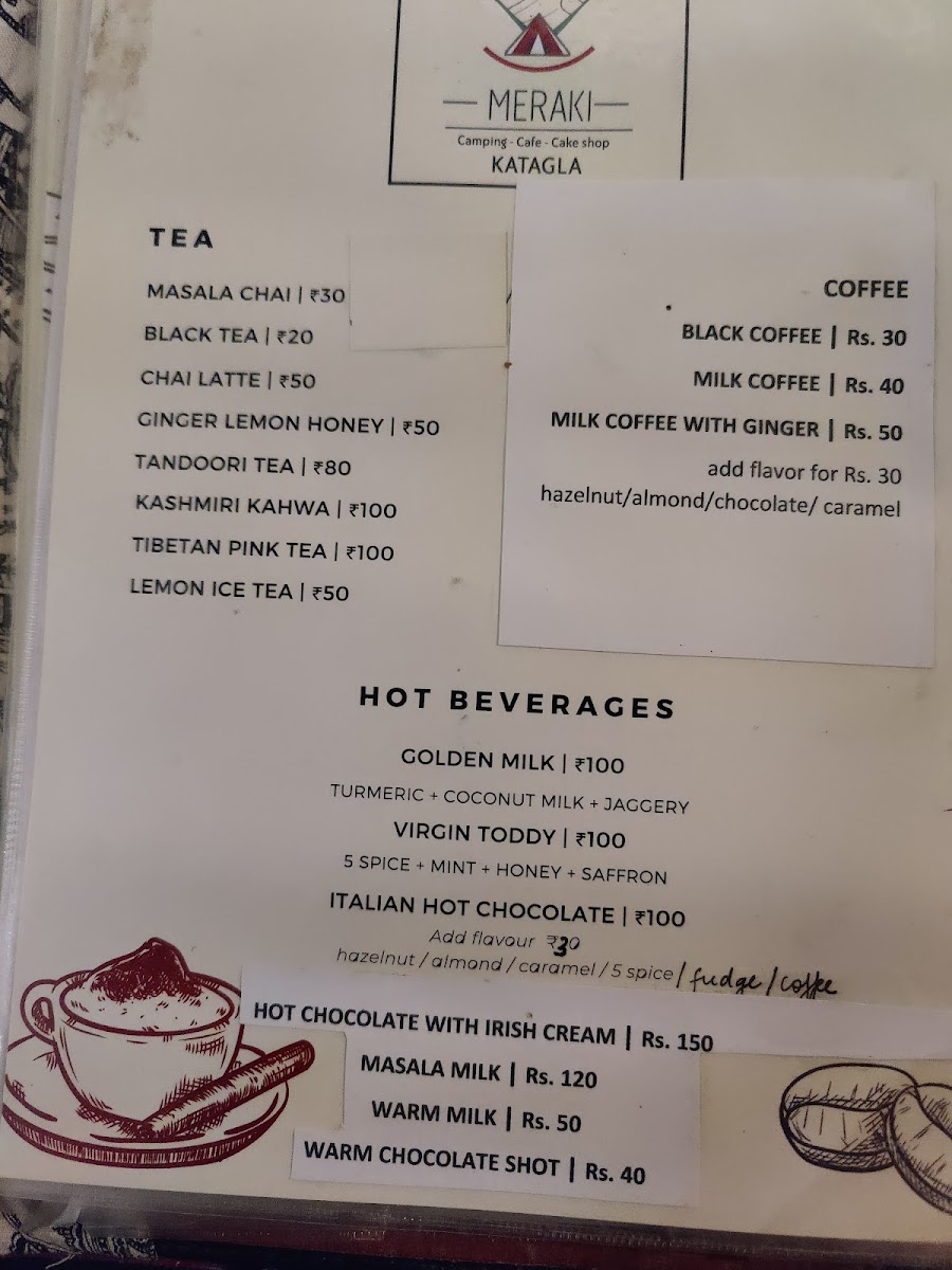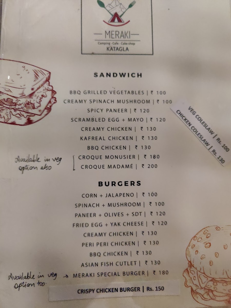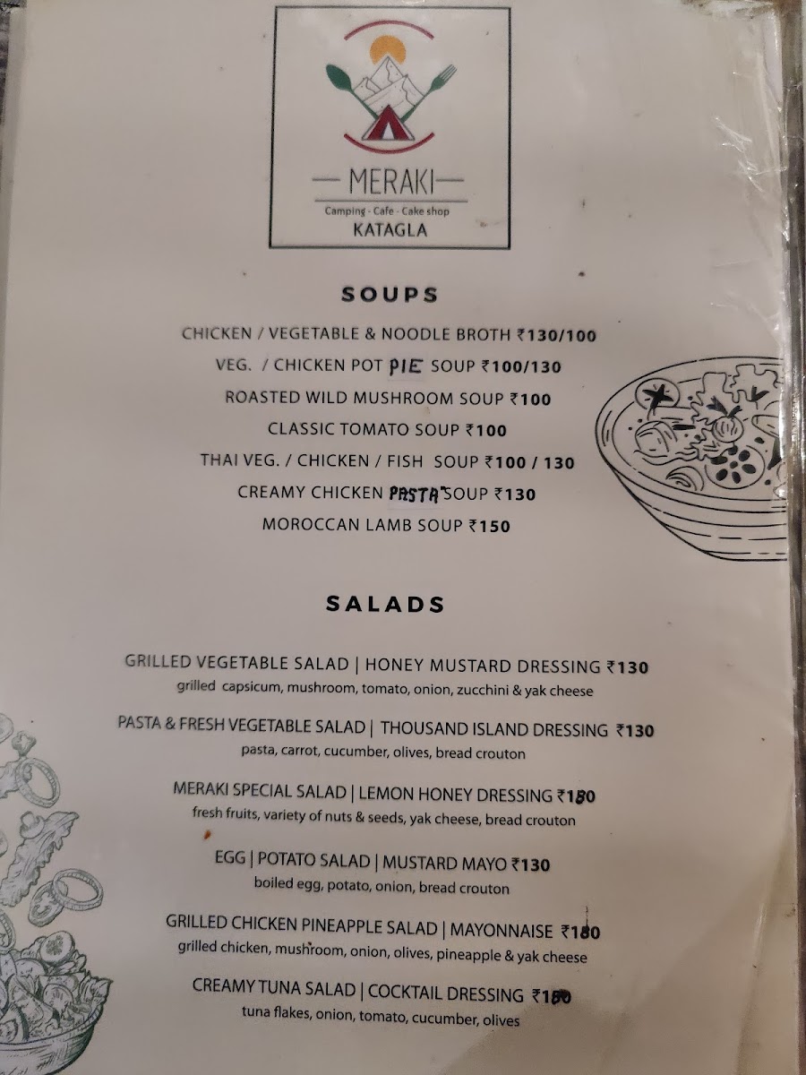 The menu at Meraki cafe camping and cakes offers a variety of options suitable for different times of the day, including breakfast, light meals, and casual dining. The menu is organized into several groups, featuring drinks, snacks, main courses, and desserts.