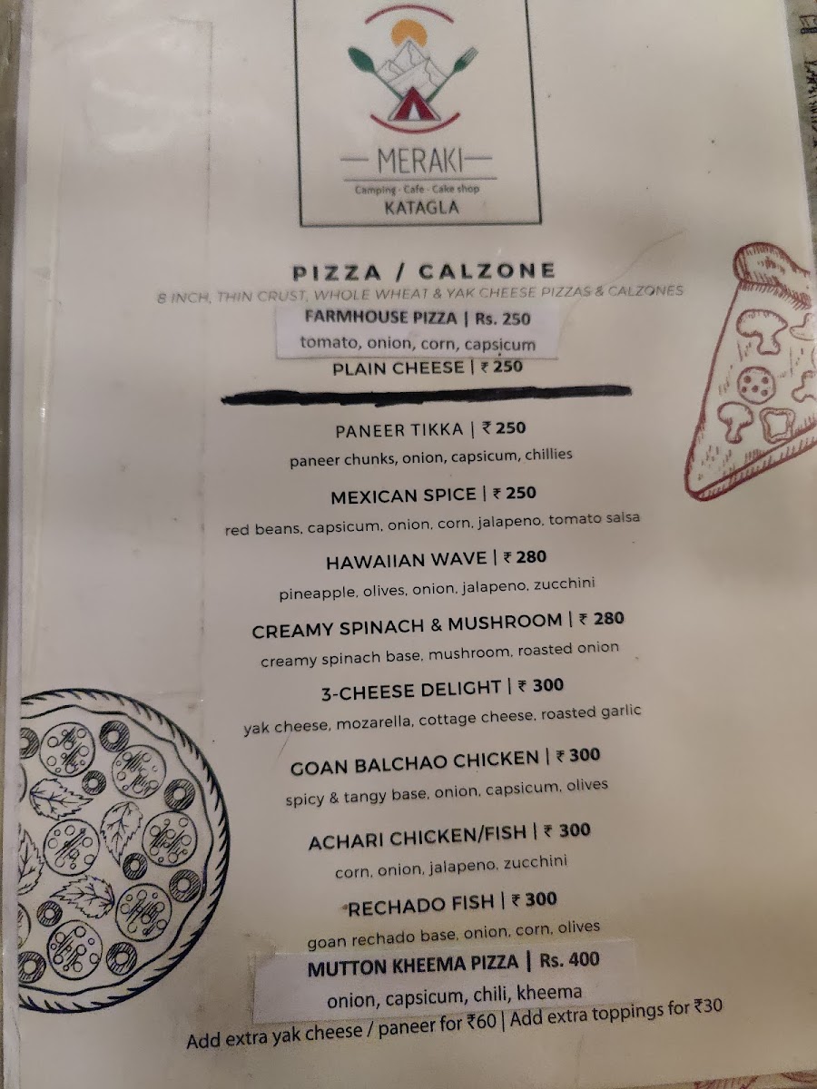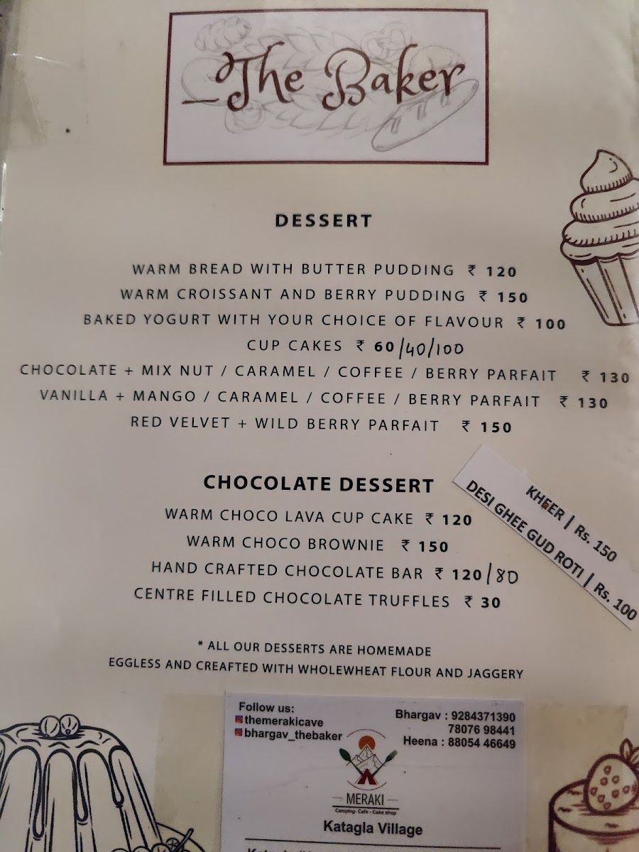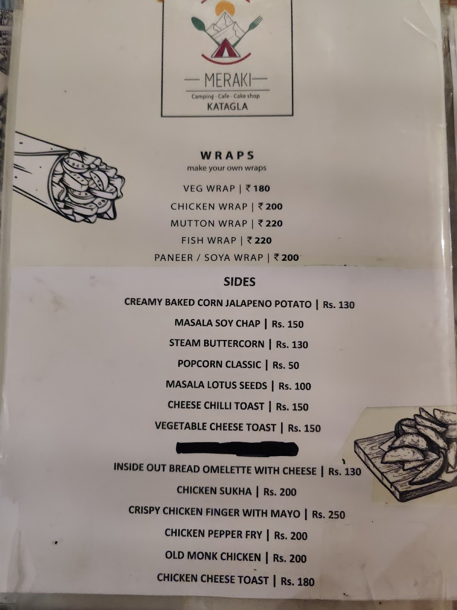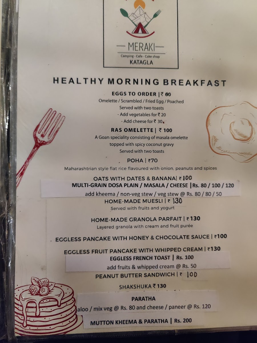 The menu at Meraki cafe camping and cakes offers a variety of options suitable for different times of the day, including breakfast, light meals, and casual dining. The menu is organized into several groups, featuring drinks, snacks, main courses, and desserts.