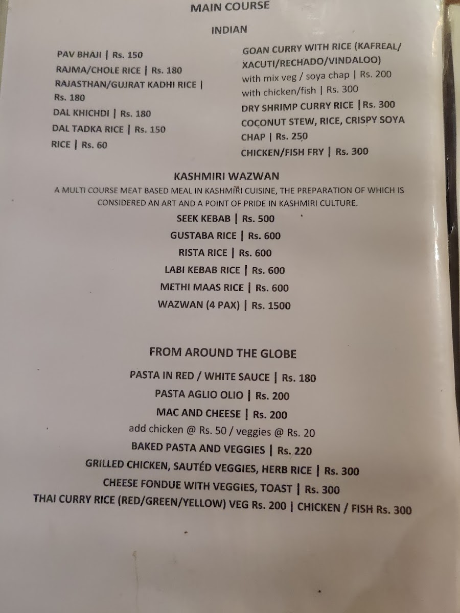 - Main Courses and Light Meals: The menu includes a range of savory items such as Pork Burger Sliders, Crispy Chicken Burger, Bacon Sandwich, Spinach Corn Pizza, Mexican Pizza, Veg Gujrati Thali, Thai Curry with Chicken, Aloo Bhaji Aamras with Puri, and Goan Bibinka. These options cater to diverse tastes and can serve as either light meals or more filling dishes.